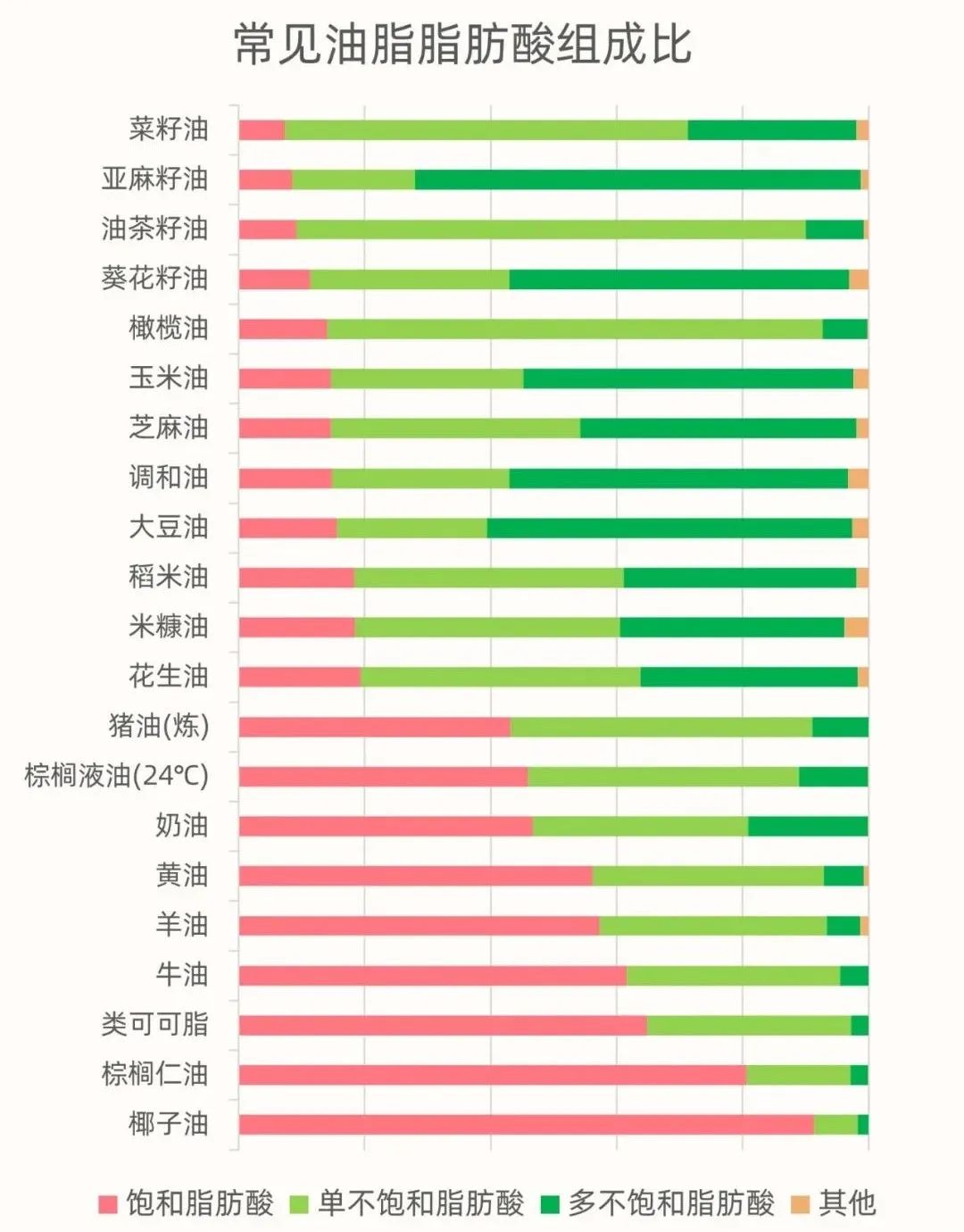 比如:橄榄油、茶油、菜籽油中的单不饱和脂肪酸含量较高;玉米油、葵花籽油中富含亚油酸;亚麻籽油中富含α-亚麻酸。