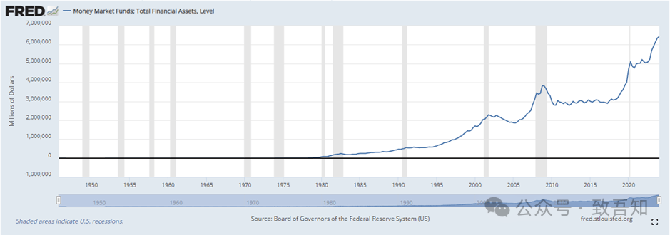 货币市场基金与利率水平呈正相关。在高利率环境下,投资者倾向于选择这些基金,因为它们相较于其他投资提供了更好的短期收益率。自美联储于 2022 年第二季度开始加息以来,货币市场基金的总资产从 5.32 万亿美元增长至 6.5 万亿美元,两年多时间内增幅达 23%。
