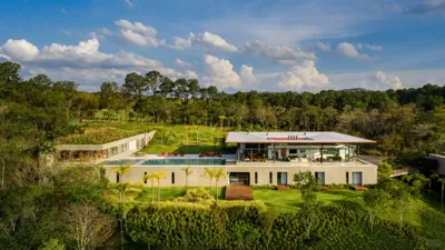 位于巴西圣保罗附近的殖民时代城市坎皮纳斯(Campinas)郊区郁郁葱葱、连绵起伏的丘陵中,散布着森林小树林,顾名思义,享有相当美的景色。巴西事务所Bernardes Arquitetura利用原始位置的优势,设计了一座在建筑和景观方面令人惊叹的房屋。这座低矮的建筑采用混凝土裙楼的形式,部分建在山坡上,顶部有一个细长的玻璃凉亭,尽管总建筑面积为 2,650 平方米,但仍保持低调。公共区域以展馆为中心,私人区域在下层展开,体量构图也反映了室内配置,并确保所有室内空间的视野一览无余。该房屋拥有种植的屋顶部分,周围的花园和栖息在山谷上方的广阔无边泳池,与建筑物和谐地融为一体。