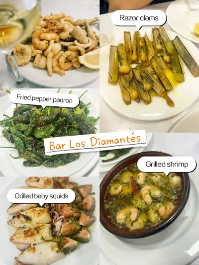 Bar Los Diamantes:房东推荐。Plaza Nueva旁边的店,我们吃了好几次。印象最深的是Razor clams竹蛏,Grilled shrimp也很不错。这两个菜图片看不出来什么,但是有很独特的香味,欧美人做菜比较讲究香料的研究使用。羊排性价比很高。烤小乌贼Grilled baby squid我个人觉得一般,但也看到有人说觉得很好吃。会给一份tapas,有的时候是小份海鲜饭,有的时候是fried拼盘一类的。