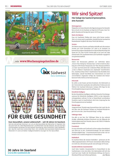 继续分享四天前收到的Wochenspiegel免费报纸里的内容,有一篇超有趣的数据介绍小小的萨尔兰州在哪些领域稳坐全德第一。图2是原文,以下是数据解读