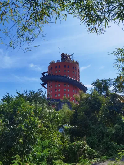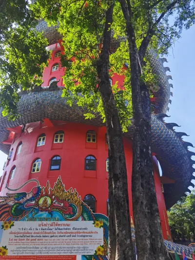 曼谷周边“待开发”游览的城镇有很多,佛统算是其中之一的“一日游”好所在,其实我不太确定它算不算“冷门”,最开始吸引我关注到它的就是图1-3的“蟠龙寺”(也叫“三攀寺”),从吞武里火车站出发,火车朝佛统方向在半路一个叫“Nakhon Chaisi”站下车后打车去的,如果不是自驾或者打车,个人觉得这个寺庙不是非去不可(原因后面我会说),下站的地界鸟不拉屎,好心的路人老奶奶可能一度担心我们是下错车,用全泰文表达了大概意思是你们要去哪里,这里打不到车,只有出去外面哪里哪里才能打到车,大概需要300株这些过经过脉的信息,虽然一句都听不懂但好像又完全听懂了。grab打到车过去好像印象中花了200株左右,在一个类似高速路旁的村上,泰国寺庙这种惊炸炸的颜色其实挺多的,不过矗立在一片低矮房屋之中,远远看去还是莫名挺好看,本来满心期待上到寺顶眺望看看,结果之前看的博主们给的信息“自愿”给香火钱变成了外国游客强行80株/人所谓的电梯维护费才能登顶,这一点让我不爽,可能从众来说本着“来都来了”的心态这80株再不爽都会给,然而我是人,不是从和众,我不,不是钱的问题,我一直觉得寺庙“强行”收费这种行为令人反感,泰国其实除开那些for游客的一些寺庙,绝大多数的寺庙香火钱都是“自愿”的,这一点其实是尊重并且理解的。虽然没登顶也折腾了好一阵,来一趟也算是了了个心愿。