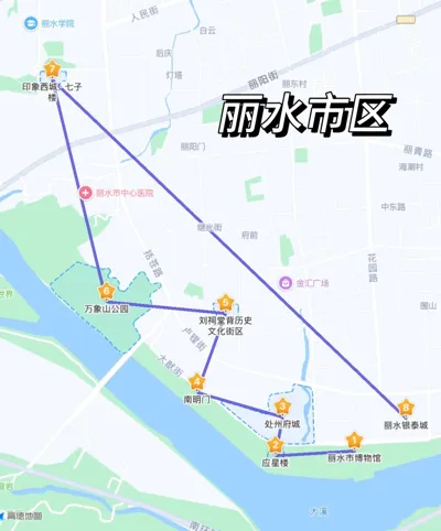 丽水博物馆→应星楼→ 处州府城→南明门→刘祠堂背→ 万象山公园→七子楼→银泰城