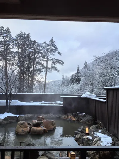 我们住的「和洋式房带私汤」!45㎡超大空间,有榻榻米客厅+西式床铺~最爱房间里的半露天风吕❄️,边泡温泉边看雪景真的太浪漫了!(记得提前预约私汤时段哦)