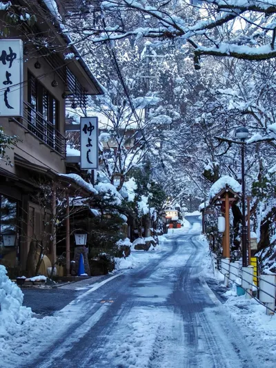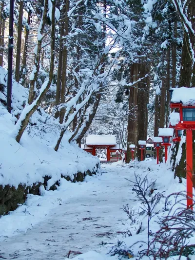 被雪覆盖的贵船富士屋在充满日本氛围的景色里拍照
