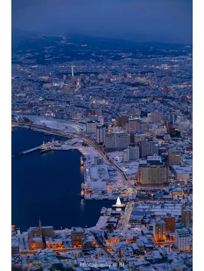 1.函馆山:函馆山是观赏函馆夜景的最佳地点之一,其夜景被誉为“世界三大夜景”之一。可以坐缆车上山,从山顶可以俯瞰整个函馆市的灯光,冬季建议下午三点半上山,可以拍到蓝调时刻及夜景。(图1-5)