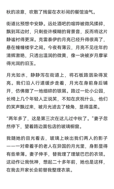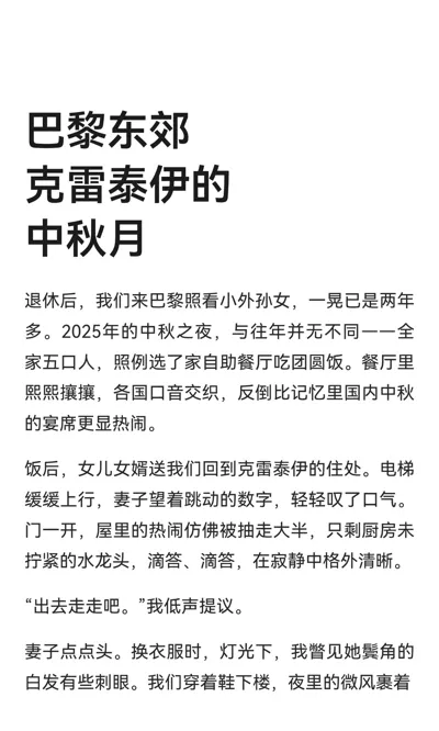 在巴黎克雷泰伊的中秋夜,我与妻子在月光下散步,感受异国他乡的宁静与乡愁。妻子回忆起二十年前的中秋,我们相视而笑,享受着与家人团聚的温馨。中秋的月亮,见证了我们从年轻到老去的时光,承载着家的温暖与文化传承。