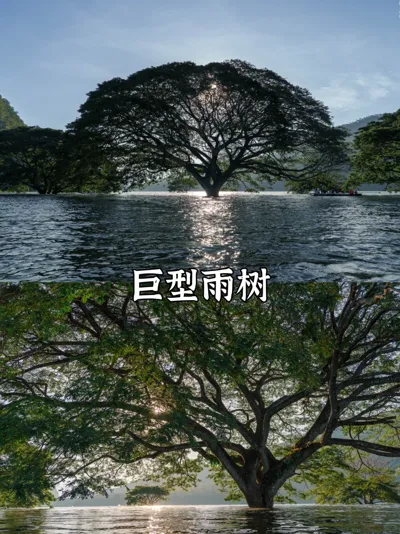 其实这里以前是一个村庄,1984年修建湄安坝后水位上涨,村民搬走, 只留下这棵几十年树龄的雨树(金合欢/จามจุรี), 现在成了湖中最特别的风景