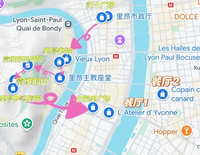 总体行程:从市政厅出发旁边就是沃土广场,随后可以步行前往里昂老城区,Citywalk漫步在老城区感受历史的魅力,随后可以步行前往里昂主教堂,F2小火车的上车点就在附近,随后乘坐F2山间小火车前往富微耶山的三个景点,这是俯瞰里昂城市的最好机位之一!最后前往白莱果广场欣赏中央喷泉的美丽景色!