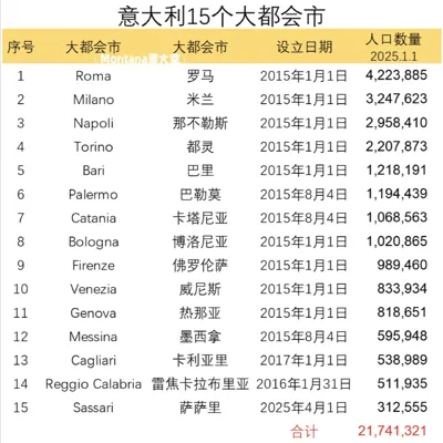 3⃣️目前,意大利共有15个大都会市,按时间分4批: