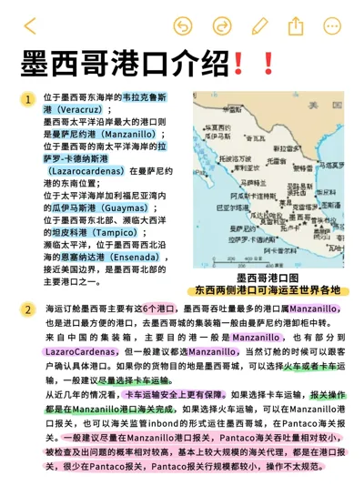 海运订舱墨西哥主要有这6⃣个港口,墨西哥吞吐量最多的港口属Manzanillo,也是进口最方便的港口,去墨西哥城的集装箱一般由曼萨尼约港卸柜中转。