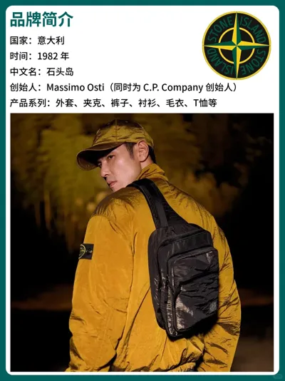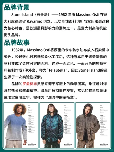 🪨Stone Island(石头岛)——1982 年由 Massimo Osti 在意大利摩德纳省 Ravarino 创立,以功能性面料创新与军用服装改良为核心特色,是