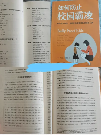 我在这本书中学到了很多实用的知识和技能,了解了霸凌背后的动机,理解了霸凌与冲突的区别。了解了霸凌行为的不同类型:肢体霸凌,这是我们平常最常见的;言语霸凌,这是我们经常忽略的;网络霸凌,这是网络时代的霸凌新方式。知道了如何正确引导孩子健康成长,既不能让孩子成为霸凌者,也不能让孩子成为被霸凌者。重视被霸凌者的求救,勇敢地和孩子一起面对霸凌,并结合学校,社会阻止霸凌的继续,帮助孩子走出霸凌的阴影。
