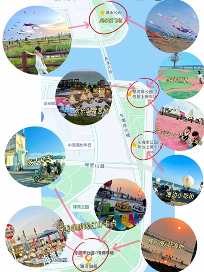 游玩路径可从海浪咖啡(网红打卡地)➡️东海岸2号停车场(小吃1⃣️条街)➡️东海岸3号停车场(露营地)➡️海阳公园(大型风筝)《反过来走也可以哦》