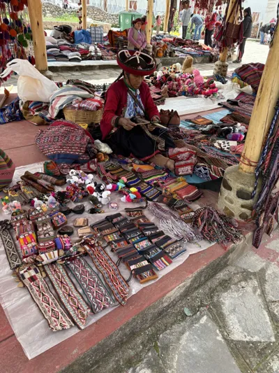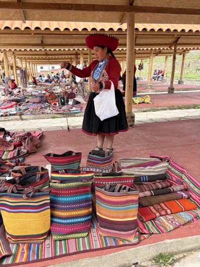 每周日的市集是Chinchero的灵魂。与游客云集的其他市场不同,这里仍是当地社群交换物资、维系传统的核心。清晨,穿着传统服饰的盖丘亚妇女带着手织羊驼毛毯、鲜艳纺织品和新鲜农产品聚集在广场。交易声以古老的盖丘亚语为主,纺织品尤具特色,妇女们用代代相传的植物染色和编织技艺,在布料中编织着安第斯的世界观与神话符号。