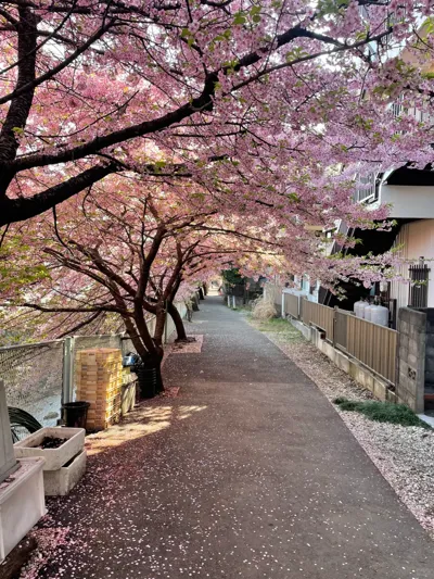 离新宿站半小时的车程,在一个安静小美的社区旁。清早会看到遛狗的居民、停下来给樱花拍照的慢跑者、穿着学生制服的年轻男孩,还有带着玩偶娃娃和樱花打卡的朴素姐姐。我也是传统打卡节目:又又带着711的饭团和野蔬汁,在落英缤纷的樱花下干饭。