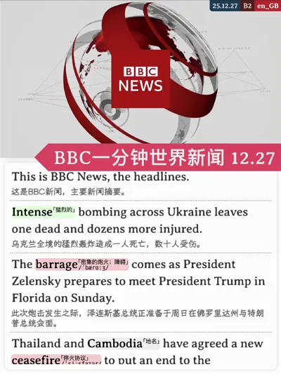 主要内容:乌克兰遭轰炸致伤亡;泽连斯基将见特朗普;泰柬达成新停火协议;圣诞游泳失踪者追思;英国防部推带薪间隔年;治疗乐队吉他手去世。