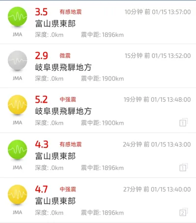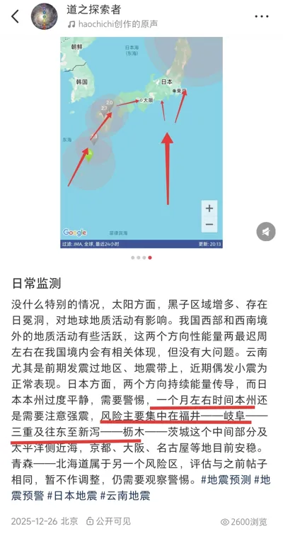 岐阜——富山交界处,连续多次发震,前期该点位已经有过异常小震,我在之前的帖子里已经分析提醒过,从发震数据看,该点位的发震有两大趋势,一种类似前期秋田县、宗谷地方南部的短时间内连续小震至中强震级别的发震,可能是诱发周边强震、大地震的前期地质活动,尤其可能是太平洋侧地区(伊豆——千叶——茨城及周边地区)强震/大地震的前期表现,这种也是日本地震的一个特点;一种是该地区大地震的前兆异常,即发震地区后面会发生大地震,该地区历史上也是有大地震记录的,目前首先需要密切关注72h内的发震数据变化,然后持续监测一周。总之近一个月以来,日本多地尤其是本州及北海道,出现了异常的地质活动,风险不断上升,近期有赴日计划的朋友,务必警惕。另外,不要老是问什么x月x日——x月x日哪里安全吗有没有地震,再次强调,如果能明确x月x日哪里有没有地震,有这个水平绝对可以拿诺贝尔奖,不然就是骗子。我这都是基于各类数据和线索的风险预判和概率评估,咱们要讲究科学的谨慎表达。