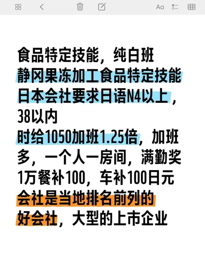 时给1050加班1.25倍,加班多,一个人一房间,满勤奖1万餐补100,车补100日元