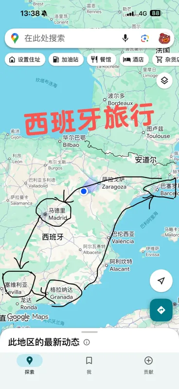 目标城市:巴塞罗那(3 晚),马德里(2 晚),塞维利亚(2 晚),格拉纳达(1 晚)