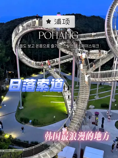 浦项这个 Space Walk真的像“走路版过山车”!整条是钢结构的螺旋步道,站上去视野超开阔,白天是海景一整个敞亮,晚上亮灯之后又是另一种氛围,拍照巨出片