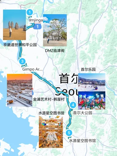 京畿道和平世界公园➡DMZ临津阁➡金浦艺术村-韩屋村➡水原星空图书馆➡首尔乐园