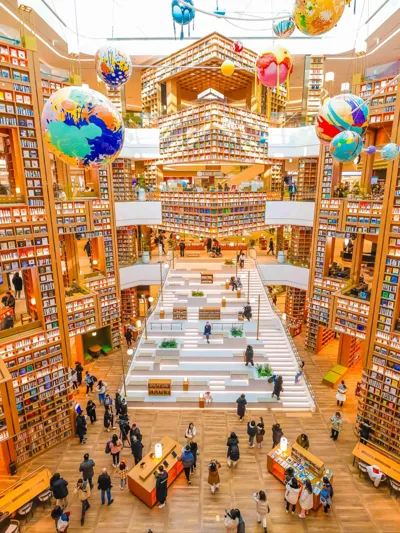 来韩国必打卡的星空图书馆是图书爱好者的圣地!拥有4层星空主题设计,书架高耸,自然光透过玻璃天窗洒落,夜晚可赏星。这里不仅是知识的海洋,是艺术与文化场所