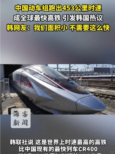 【中国动车组跑出453公里时速 成全球最快高铁 引发韩国热议 韩网友:我们面积小 不需要这么快】