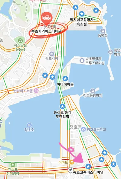 选择的东首尔站出发(2号线江边站),到达的是束草市外巴士客运站(p1地图上显示有两个客运站,原本我也以为是到下面那个站,结果不是,出行的朋友要注意一下哦)