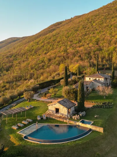 Villa Subtilia 是一座16世纪的老房子,藏在翁布里亚的 Tenuta di Murlo 庄园深处。位置在山顶,视野直接望向一座中世纪古堡和大片高尔夫球场。从无边泳池看出去的那一幕,真的像走进了文艺复兴时期的画。
