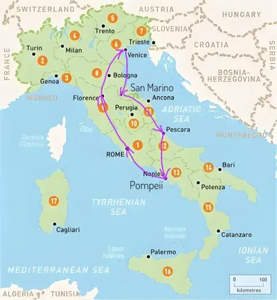 小节:我这次意大利之行主要目的地是佛罗伦萨朝圣和体验威尼斯双年展;在罗马不开车对我来说是明智的;在那不勒斯开车真是噩梦;高速收费站尽量走人工收费通道;市区油站普遍比高速油站便宜,但是得学会自助加油;在威尼斯和庞贝之间,路途较远,因此选择经停圣马力诺和佩斯卡拉两站,也算是休整;从庞贝古城到维苏威火山公园开车半小时,很方便;是的,我没去罗马的斗兽场、佛罗伦萨的圣母百花和威尼斯圣马可广场上的那个大殿都忘记名字了,总觉得这几个看看外立面就够了