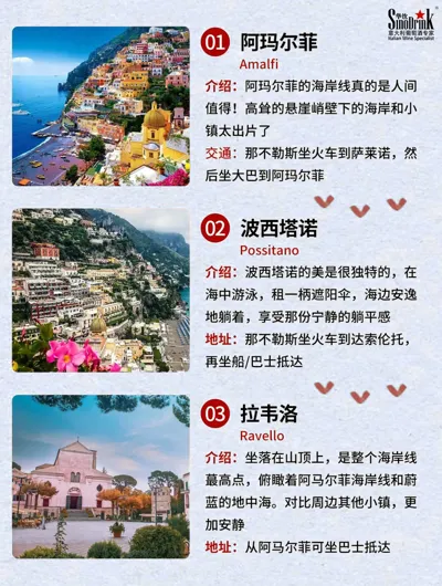 图片和文字不匹配01&02图片都是波西塔诺,04的图片是阿玛尔菲不是索伦托;05的图片不是卡普里岛是波西塔诺图01的夜景