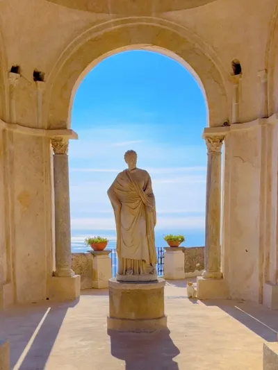 这座别墅有着悠久的历史,可追溯到十一世纪,后来在英国贵族 Ernest William Beckett 手中重建。他将古董、雕像、石柱从意大利各地带来,打造出一个既融合古典又有浪漫气息的花园。平台上,雕像背对深海静默,他们的身影仿佛守护着拉韦洛整个悬崖与海岸。