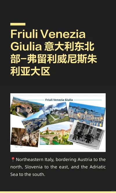 弗留利威尼斯朱利亚大区,位于奥地利、斯洛文尼亚和亚得里亚海之间,面积7,858平方公里,人口120万。