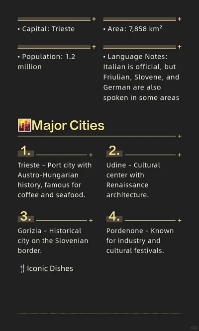语为官方语言,部分地区使用弗留利语、斯洛文尼亚语和德语。主要城市有特里耶斯特、乌迪内、戈里齐亚和彭德诺内,特色美食包括酥皮火腿、弗留利馅饼、匈牙利炖牛肉等。