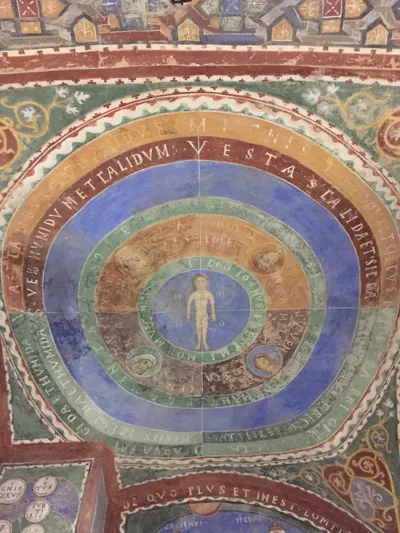 阿纳尼大教堂地穴空间的壁画叙事逻辑揭示了一处思想史的褶皱:第二拱顶以古希腊自然哲学的\四元素说\(气、火、土、水)与希波克拉底“体液学说”构建的宇宙生成论图景(图1),取代了传统的《创世纪》图像志系统。