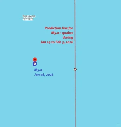 红线为预测线,我已预测2026年1月24日至2月3日期间,在红线附近(250公里范围内)将发生5.0级及以上地震。