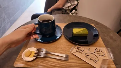 店员姐姐很温柔,在纸巾包装上手绘了两个萌物~抹茶蛋糕很醇厚,配美式吃完甚至有点心悸 可见用料!