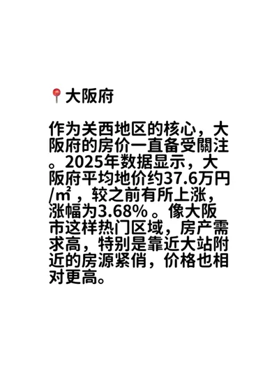 作为关西地区的核心,大阪府的房价一直备受關注。2025年数据显示,大阪府平均地价约37.6万円/㎡ ,较之前有所上涨,涨幅为3.68% 。像大阪市这样热门区域,房产需求高,特别是靠近大站附近的房源紧俏,价格也相对更高。