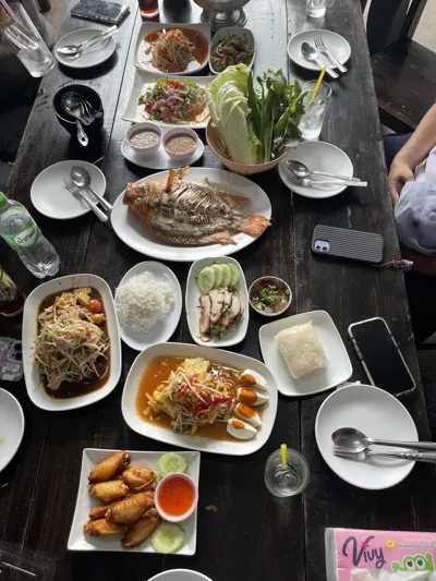 上面就是午餐的饭菜,真正的泰国普通工薪阶层的日常路边普通餐馆的小型聚会,主要就是各种somtum、猪颈肉、冬阴功汤、鱼和血蛤算是主菜,味道以酸辣为主,配各种蘸酱。