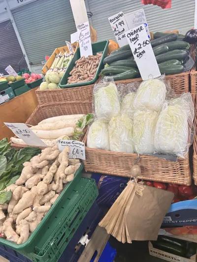卡迪夫哪里可以买到大白菜和萝卜呢? 请看图片!就在卡迪夫市场Cardiff Market里面, 卖肉那一排的对面有一家菜店,菜类丰富、新鲜,价格也比超市便宜很多。