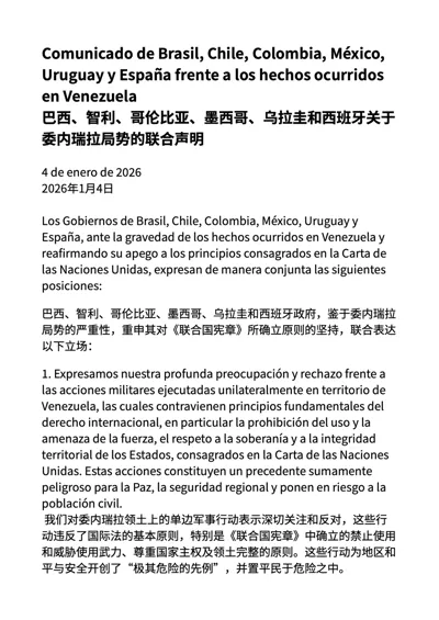 、智利、哥伦比亚、墨西哥、乌拉圭和西班牙六国1月4日就委内瑞拉局势发表联合声明,重申其对《联合国宪章》所确立原则的坚持,重申委内瑞拉的局势必须通过和平途径解决,联合发表以下立场,声明的中西双语翻译版本详见图片。