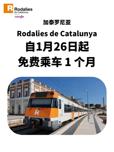 自 2026 年 1 月 26 日起,为减轻对乘客造成的不便,Rodalies de Catalunya 铁路服务将免费开放,免费措施维持 1 个月。持有 30 日票的乘客可免费申请延期使用。