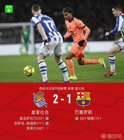 北京时间1月19日西班牙足球甲级联赛 联赛 第20轮,皇家社会主场对阵巴塞罗那。上半场,奥亚萨瓦尔凌空抽射破门。下半场,亚马尔助攻,拉什福德扳平。不过,格德斯很快便抽射得分,帮助皇社再次领先。巴萨整场比赛3个进球被吹,另外5次击中门框。全场比赛结束,巴萨1-2不敌皇社,各项赛事11连胜被终结