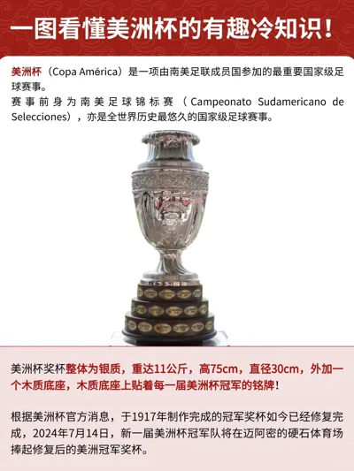 根据美洲杯官方消息,于1917年制作完成的冠军奖杯如今已经修复完成,2024年7月15日,新一届美洲杯冠军队将在迈阿密的硬石体育场捧起修复后的美洲冠军奖杯。