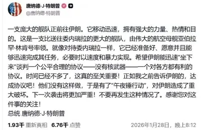 11. 2026-01-28:特朗普称伊朗距拥核“约一月”,警告若策划暗杀他将“抹去伊朗”,要求伊朗终止铀浓缩、限制导弹计划、停止支持代理人武装;伊朗**卫队称“战争爆发绝不后退”,警告美军基地将成合法打击目标;伊朗外长表示可谈判,但需美方停止威胁、放弃过度要求。