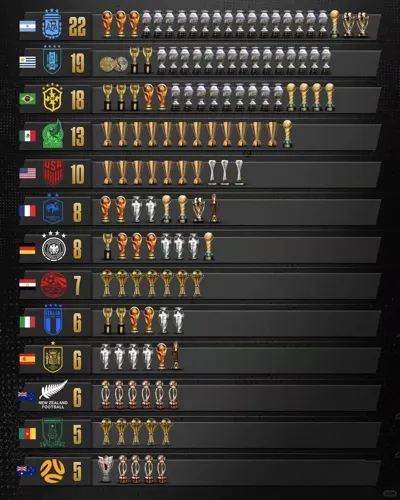 南美洲的阿根廷、乌拉圭和巴西以其在世界杯和美洲杯上的卓越表现,共赢得了59个奖杯,几乎占据了这份榜单的半壁江山。