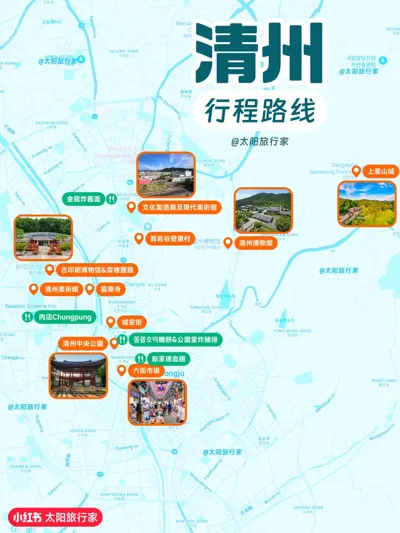 ▶從首爾也可搭大巴到清州,或搭KTX到五松后转公交到清州<br />·<br />Tips<br />▶必吃清单补两个:近40年金龙石锅炸酱、本地人从小吃的六街市场金刚雪浓汤<br />▶查交通用 Nàver Map,有中文,搭公交用T-money<br />▶有更多时间可以去郊区的椒井行宫、青南台<br />▶住在道厅附近,很方便,周边超多美食,去景点也很近,别选五松