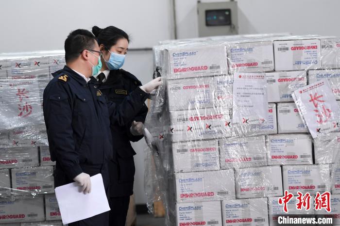 湘籍同乡会紧急采购的价值200万元的16200套医用防护服运抵长沙黄花机场。图为海关工作人员进行查验。 杨华峰 摄