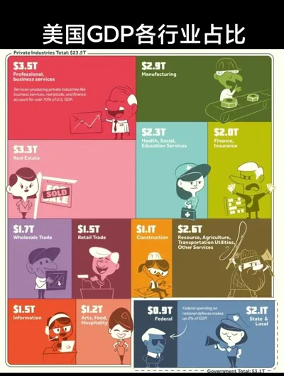 以下是美国经济贡献最大的私营企业: 年化名义GDP占美国GDP的% 1.专业和商业服务$3.5t13% 2.房地产、租金和租赁3.3万亿美元,12% 3.制造业2.9万亿美元,11% 4.教育服务、卫生保健和社会援助:2.3万亿美元,占9% ...